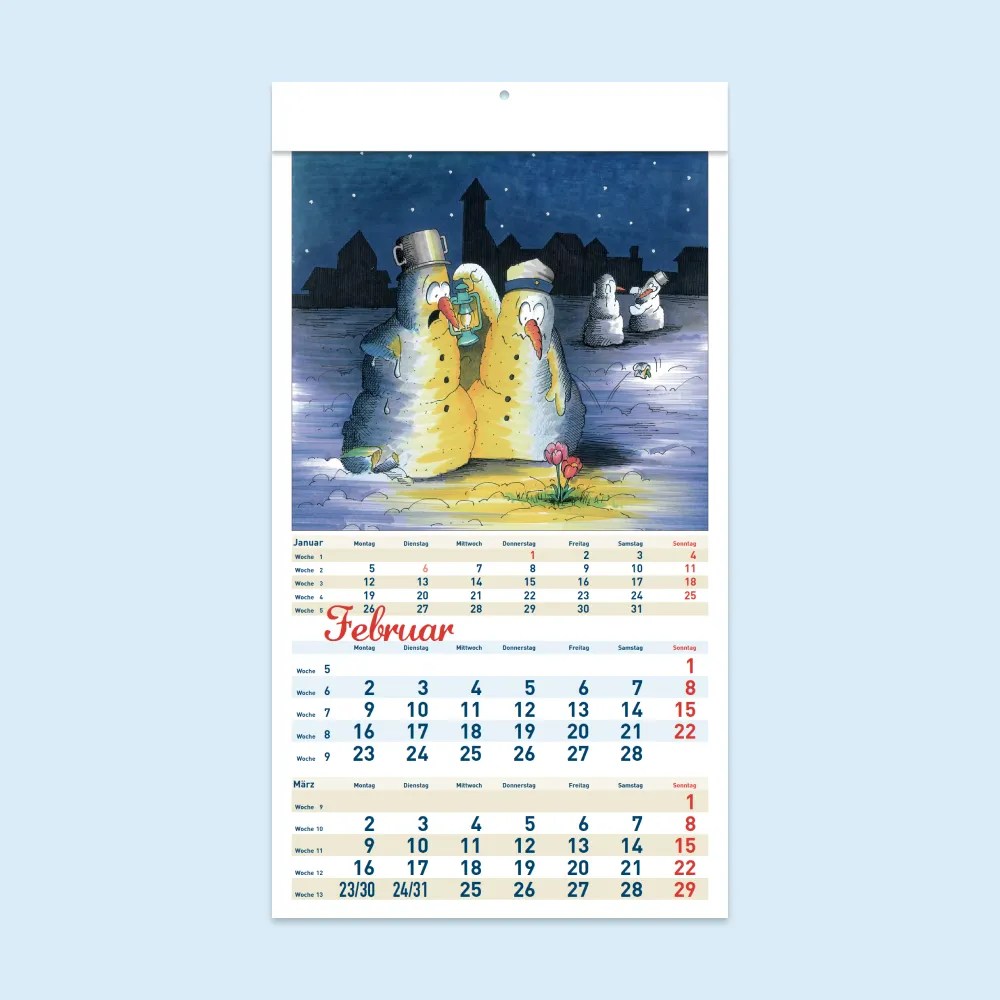 Wenn Sie an mehr als 25 Kalendern interessiert sind, erhalten Sie von uns ein persönliches Angebot. Ab dieser Menge ist es möglich, Ihren individuellen Eindruck in der weißen Kopfleiste zu gestalten.